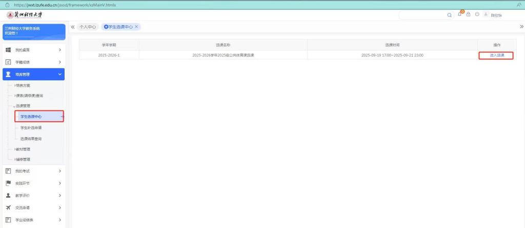 位置:培养管理--选课管理--学生选课中心---进入选课