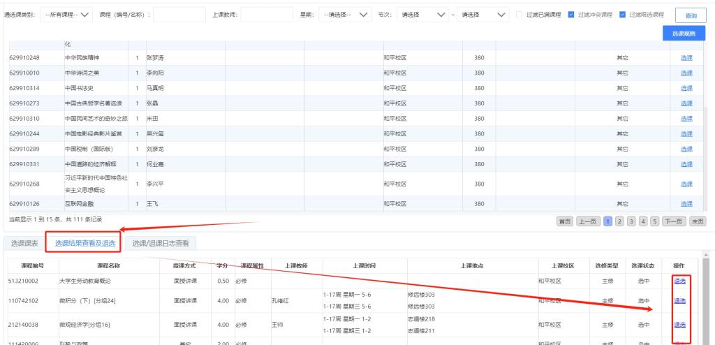 6、退课点击【选课结果查看及退选】模块,选择相应课程点击【退课】