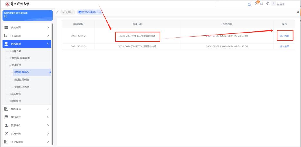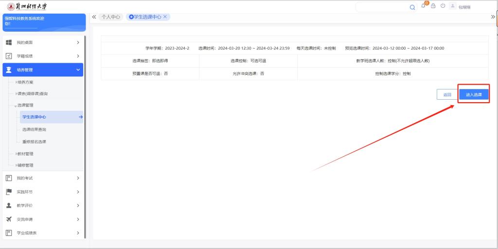 2、打开培养管理—选课管理—学生选课中心—进入选课