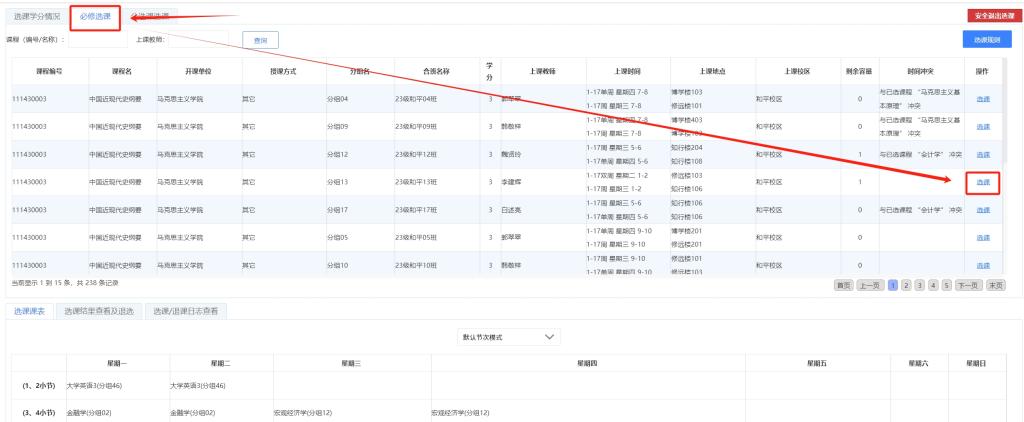 5、必修课选课点击【必修选课】模块,选择相应课程点击【选课】